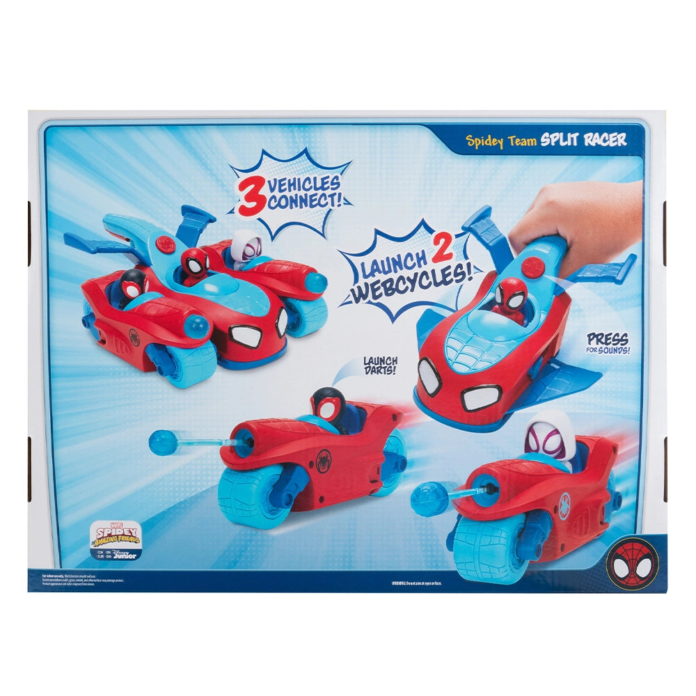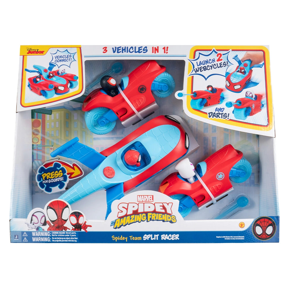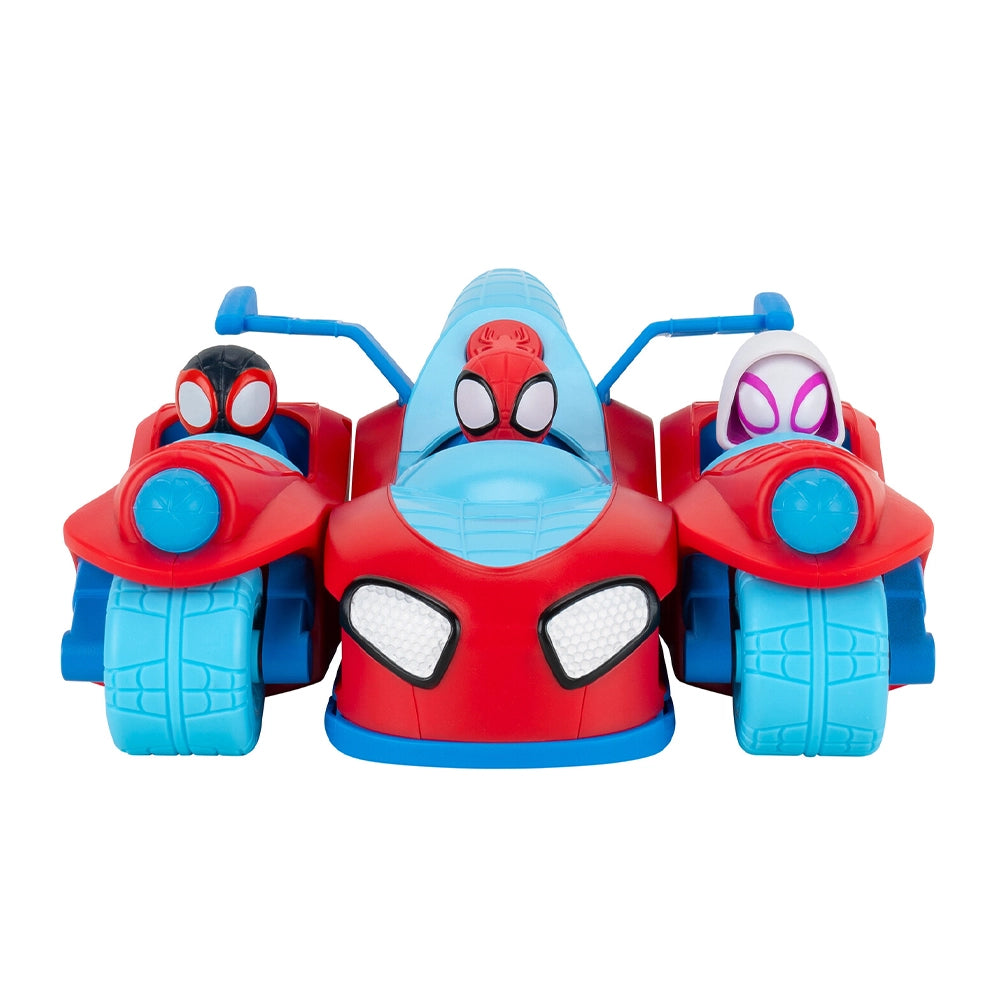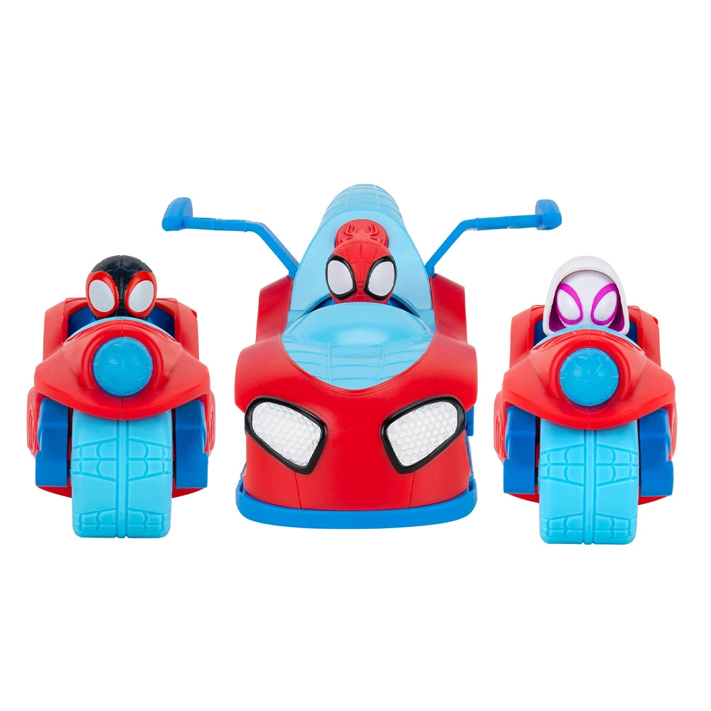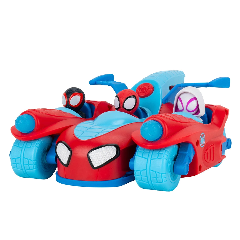Difendi la città con il veicolo deluxe di Spidey da 24cm, che si trasforma in due moto e un jet. Equipaggiato con una funzione lancia dardi, effetti sonori e due dardi inclusi. Personaggi non removibili.